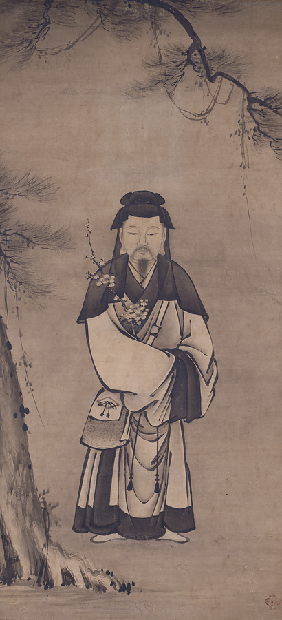 渡唐天神(天神が中国に渡り参禅したという伝説)を描く本作は、狩野派の大成者、狩野元信(一四七七~一五五九)の印を捺す一幅。すぐれた形態感覚や墨の力強さが目をひく優品である。荒々しい松は天神の象徴であり、絵の自然景観の一部でもある。こうした天神像は、世俗を離れた文人や隠者を描く中国画の主題に倣い、中世の禅宗文化の中で生み出されたとみられる。本作も恐らくその一つで、松と梅を愛した天神を、世を離れた清廉な文人のイメージに重ねている。