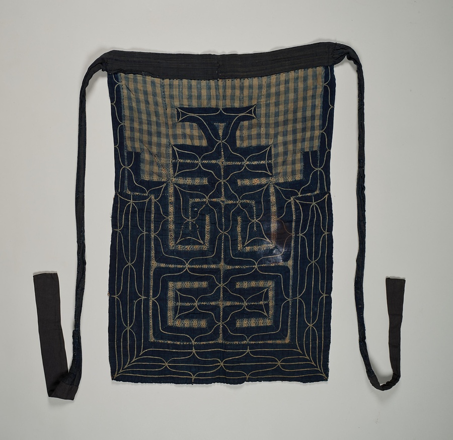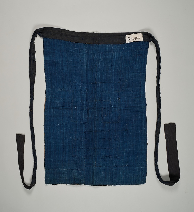 前垂+まえだ+れはアイヌ語でマエタリなどといいます。このことから本州から入った衣文化であることがわかります。女性の作業衣ですが、儀式の時に身に着けることもあります。木綿製の紐が付きます。