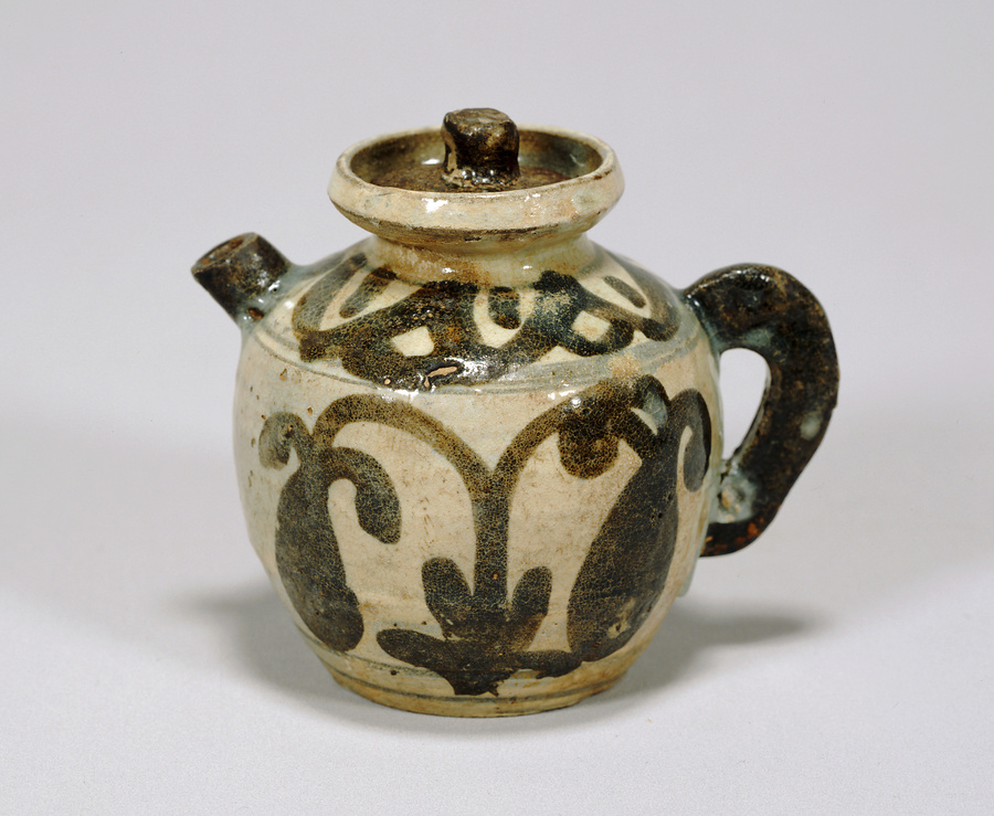 水滴と同様、硯に水を注ぐための文房具。灰色の胎土に刷毛で白化粧をほどこし、鉄絵【てつえ】で文様を描き、透明釉【とうめいゆう】をかけて焼きあげています。いわゆる絵刷毛目は韓国忠清南道【チュンチョンナムド】の鶏龍山【ケリョンサン】の東側にある公州鶴峯里【コンジュハッポリ】窯の特徴的な技法の一つで、このような器は一般に「鶏龍山」と呼ばれます。
