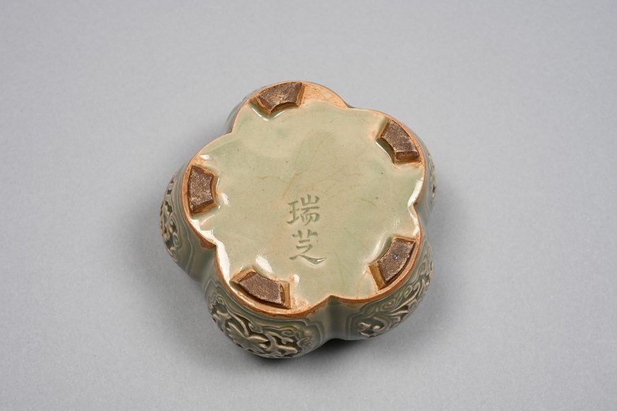 瑞芝窯では、さまざまな諸国のやきものの写しが作られるが、なかでも青磁は代表的な作例である。この作品は、南瓜の近種である阿古陀瓜に似た形をとる香炉。畳付をのぞいて底まで青磁釉が掛かり、金属の火舎をともなう。底には優品に多くつけられたという「瑞芝」の印が捺される。