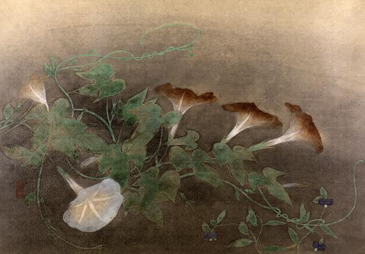 第7回院展の《京の舞妓》で徹底した細密描写を試みた御舟は、さらにセザンヌやキュビスムの考え方から琳派をはじめとする日本の古典の技法まで、さまざまなものを加えながら新しい境地を開拓していった。前者は1921年の第8回院展の《溪泉二図》に代表される作品、また後者には写実的方向を徹底させながら、そこに一種の幻想味と不思議な存在感を示す《炎舞》のような作品、そして際立って琳派の装飾的構成法の影響を示す《翠苔緑芝》(1928年第15回院展)、《名樹散椿》(1929年第16回院展)などが挙げられよう。この作品は晩年に数多く描いた花鳥画の一つであるが、朝顔の蔓を中心とした巧みな画面構成、いかにも御舟らしい写実的描写、あるいは銀砂子のきわめて効果的な使用法などほとんど完壁ともいえる技術によって、写実性と装飾性とをみごとに融合させ、さらにそこに一種の幻想味を漂わせるなど、晩年の御舟が立ち至った深い境地を示している。
