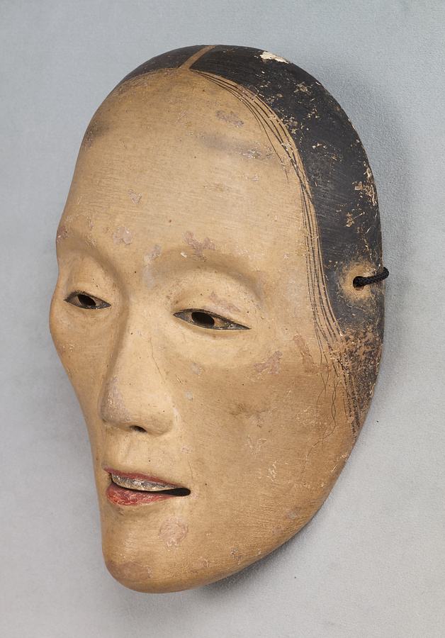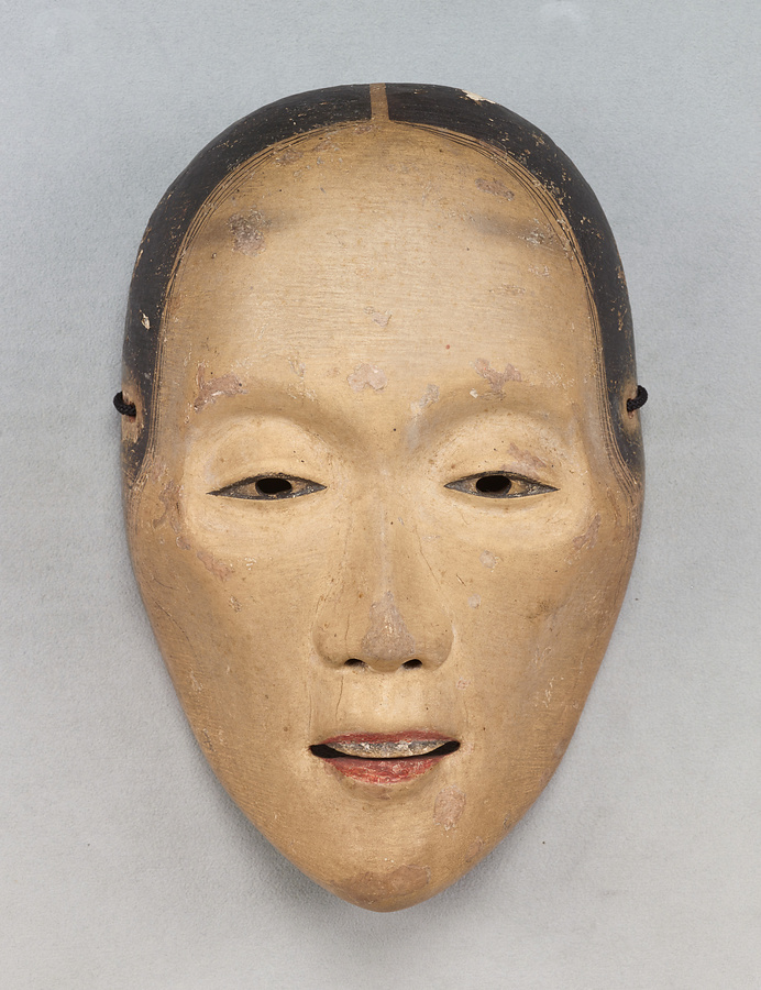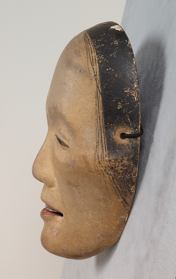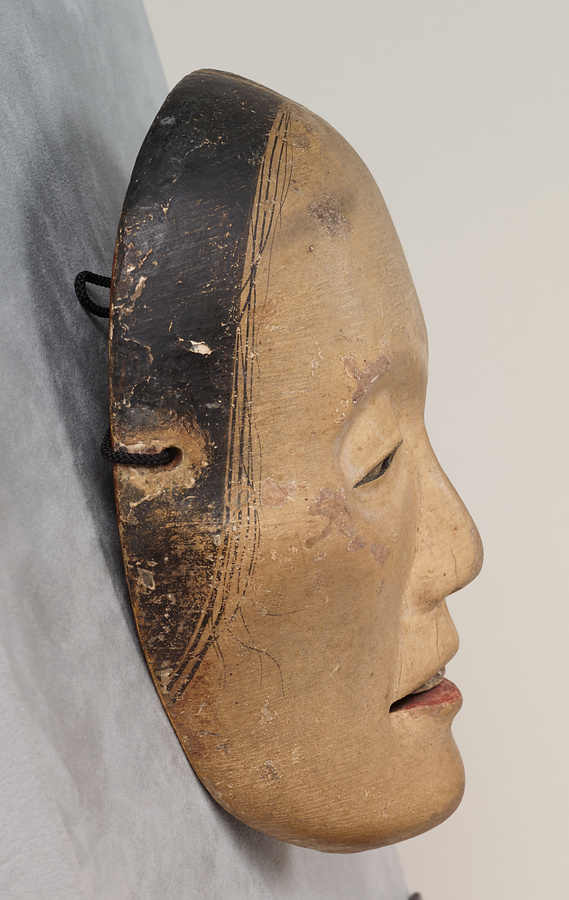 眼が落ち窪み、頬はこけて生気のない顔ですが、江戸時代に定型化した頬を面取りするような痩女に比べて自然です。夫の帰りを待ちわびて病死した妻の亡霊の役、死後も苦しむ女性の霊の役に用います。この種の面を得意とした日氷(ひみ)作とする鑑定銘があります。