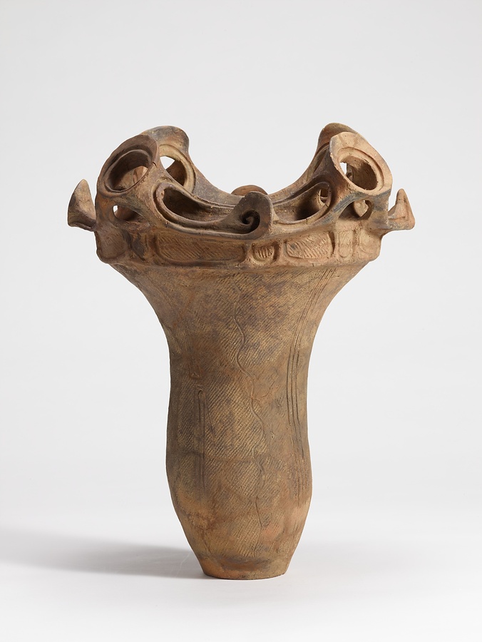 縄文時代中期の東関東地方を中心に分布する土器。口縁部に取り付けられた複数の環状の透かしを持つ4つの大把手と、渦巻文のある4つの小把手による装飾が特徴的である。この時期の日本列島では、新潟の火焔型土器をはじめとする口縁部が過剰に装飾された土器が各地で流行した。本品は、その地域性を知る上で貴重である。