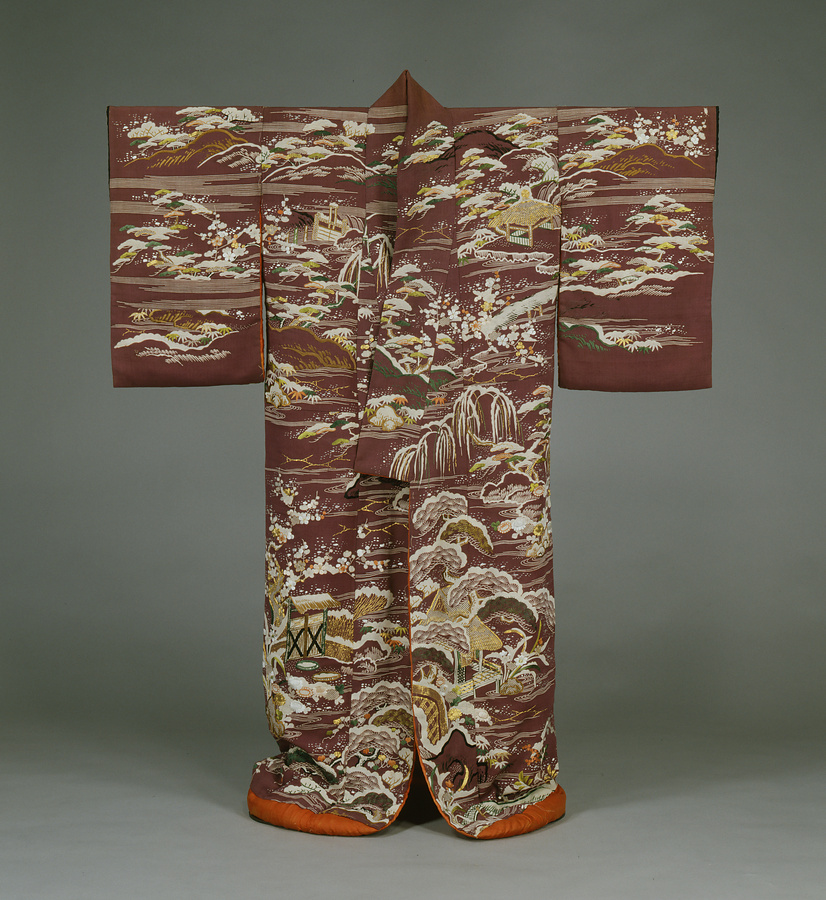 白上げで染め残した部分を効果的に雪に見せた風景模様の打掛です。所々に庵や垣根、橋、門などが配置され、人の存在を感じさせます。このように描かれない人物を想定した風景模様を「留守模様」と称します。デザインの様式から江戸時代の武家女性が着用したものでしょう。