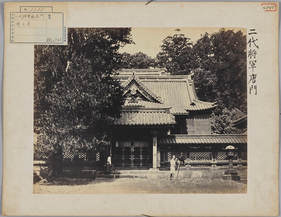 明治維新直後の増上寺を撮影した写真です。人物配置や構図など、寛永寺や旧江戸城さらに壬申検査での撮影にみる横山松三郎の好みと通じるものがありますが、撮影者の特定はできません。また境内奥深くに至っていないことから、蜷川式胤の関与もなかったと推定されます。