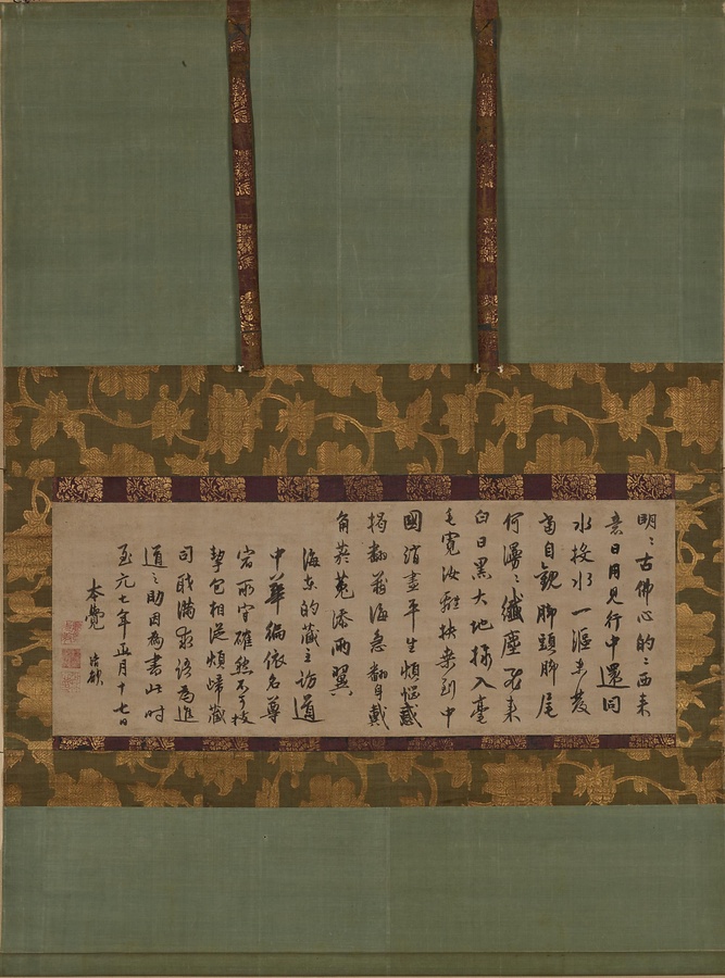 銘文:明明古仏心。的的西来意。日用見行中。還同水投水。一漚未発当自観。脚頭脚尾何漫漫。繊塵飛来白日黒。大地撮入毫毛寛。汝離扶桑到中国。消尽平生煩脳惑。掲翻蔵海急翻身、戴角菸菟添両翼。海東的蔵主。訪道中華徧依名尊宿。所守確然不可抜。挈包相従。煩帰蔵司。職満求語為進道之助。因為書此。時至元七年正月十七日。本覚清欲。 ; 「天台沙門清欲了菴章」白文方印、「少林心印」朱文方印 ; 「夢竟先□」朱文方印