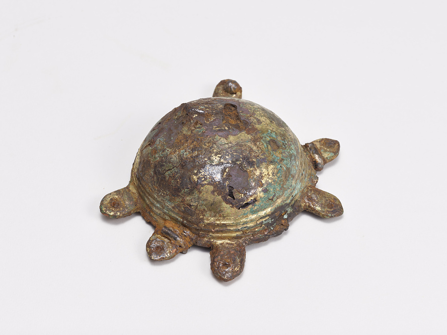 古墳時代の馬装のうち、掛け渡した革帯の結節点を固定するための金具で6脚が遺存するが、本来は9脚の雲珠と推定される。鉢本体を鋳造して鍍金し、各脚は1鋲を打つ。鉢は基部に4条の凹線が巡る。頂部は金銅板が破れ、鉄地が露出する。脚裏面にはかすかに布圧痕を認める。本品は9脚と古墳時代雲珠の中でも大型に属し、鍍金の遺存も良好で有力な首長層の副葬品と目される。伝えられる出土地付近には現在も多くの古墳群が展開し、盟主的な位置を占める古墳から出土したものであろう。