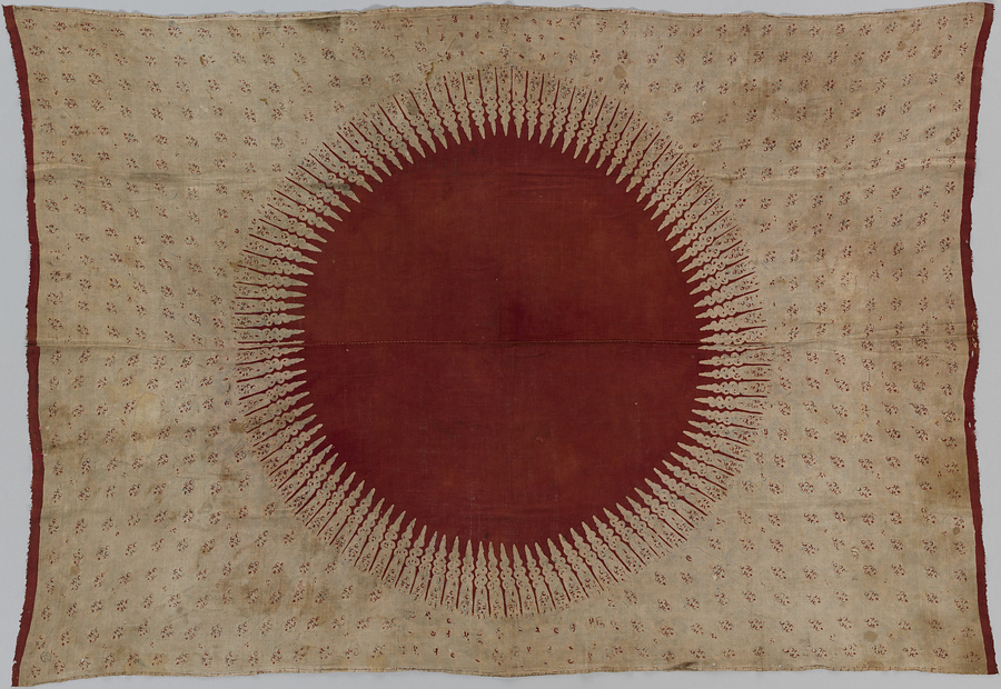 木綿布2幅を縫い合わせた大判の布の中央に鮮やかな茜地の旭日文を染め抜き、その周辺は藍色の縄目模様を地模様に茜色の花模様を散らす。布の端一箇所に1760年代(一の位は判読不可)のVOCマークが捺印される。大型の布の中央に菱形や楕円形の無地や別文様の空間をつくる意匠構成は、ジャワ更紗の典型的様式のひとつでドドットと称される王侯貴族の婚礼用の腰布にみられるもので、本品はジャワや南スマトラ向けに制作されたインド更紗であると考えられる。