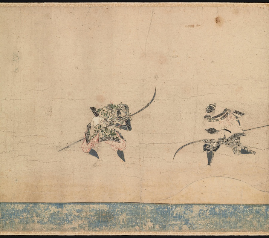 この絵巻の特徴は、何といってもサイズの大きさ。画面の天地が約45センチメートルもあり、絵巻の中でも大きい部類に入ります。画面が大きい分、人物も大きく描かれており、その表情まではっきりと見ることができます。また色使いにもご注目ください。明るい色使いで戦場の場面が軽快に描かれています。こういった色使いは南北朝時代に作られた絵巻に特有のものです。