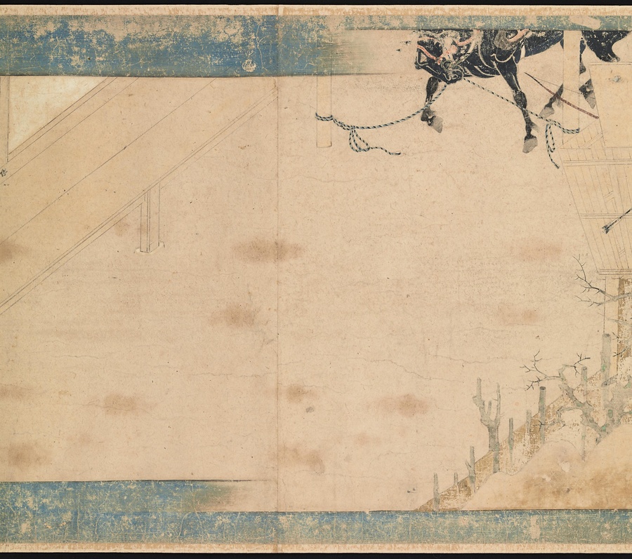 平安時代後期、東北地方で起こった戦乱を描いた絵巻です。当時東北地方で力を持っていた豪族、清原氏の一族の内部で起こった争いとその争いに介入した源義家(みなもとのよしいえ)の活躍を描いています。源義家は平安時代後期の武将で、鎌倉幕府を開いた源頼朝、室町幕府を開いた足利尊氏の祖先にあたる人物です。絵巻は3巻が残っており、今回ご紹介するのはそのうちの中巻です。