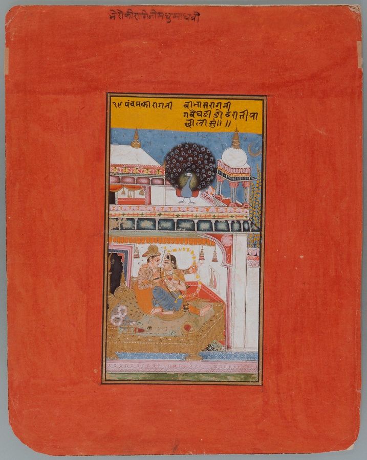 この作品は、ヴィバーサ・ラーギニーという、男女の愛をテーマとした楽曲を絵画化したものです。男女がベッドの上で身体を寄せ合い、男は夜が明けず二人の愛の時間が長く続くように、蓮のつぼみの矢をオスのクジャクに向けて射ようとしています。