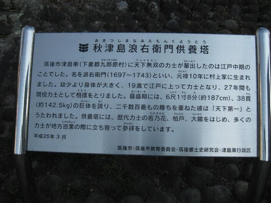 供養塔は、文政年中(没後約100年後)福島(墓碑は八女市本村杉町)の力士・揚羽空右衛門の願い出によって相撲大会が設けられ、観客から寄付金を集めて建てられたのが秋津島浪右衛門供養塔」であり、塔下には村上家の家宝の鏡が収めてある。また供養塔には、「日本第一秋津島塔」と書かれていると言うが現在は風化して、全部は判読できない。(『郷土の鏡 大関 秋津島浪右衛門』より抜粋)なお、文中にある鏡は村上家で保管している。