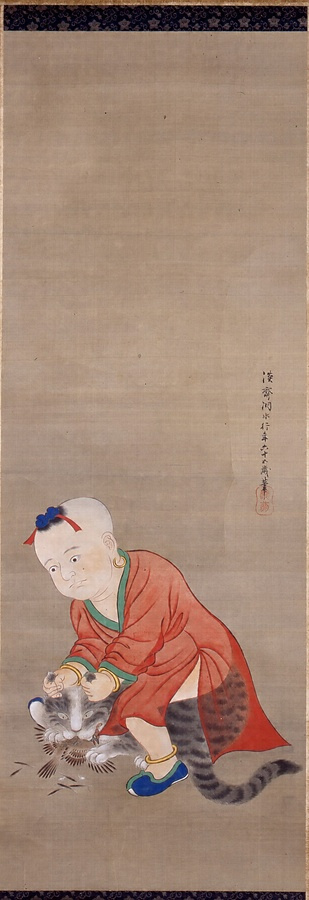 子ども・猫・小鳥の三者が一体化しながら、動きのある構図となっている。同じ構図で、中国・明代の画家姜隠が描いた「唐子図」が、東京国立博物館に所蔵されている。土浦藩の絵師、岡部洞水は、祖父、父ともに画業を専門とした。洞水自身は幕府の表絵師筆頭、駿河台狩野家の洞白愛信(1772~1821)に学んで、師匠から洞水愛敬と名のることを許された。
