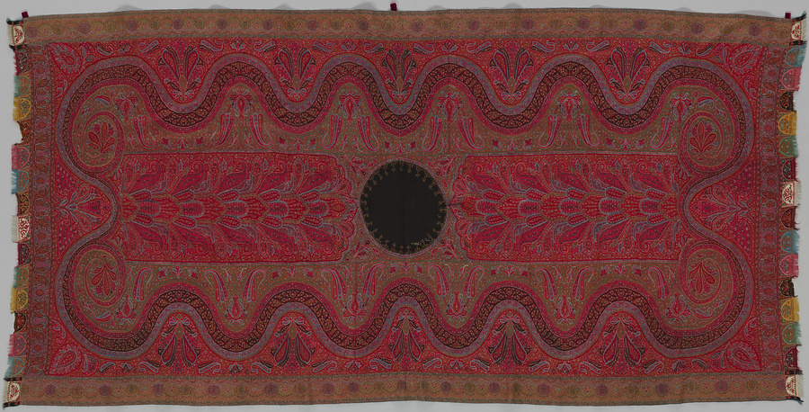 赤色の長方形の基布の中心に黒い円形の裂をはぎ合わせたカシミヤ・ショール。枝葉を広げたアブラヤシ様の文様と大小さまざまなペイズリー文様を配し、その周囲には蛇行する滑らかな曲線文様を赤色、紫色、緑色、水色、茶色の糸で綴織した裂地をはぎ合わせている。カシミヤ・ショールはもとは完全な一枚仕立て織りであったものが、より早く仕上げるために次第に部分をはぎ合わせるようになり、さらに刺繍や絵緯紋織の技法で織られるようになる。本品のように中心に黒い無地の空間を配するショールは18世紀頃から見られるもので、時代が下るに従いその形はより複雑になっていく。本品に表わされた蛇行する曲線や、枝葉を広げた棕櫚文様などは、ヨーロッパで特に好まれたモティーフである。また、ペイズリー文様はシク期(19世紀前半)のものに比べると胴部の膨らみが少ないことなどから、ドグラ期(19世紀後半)の制作と考えられる。