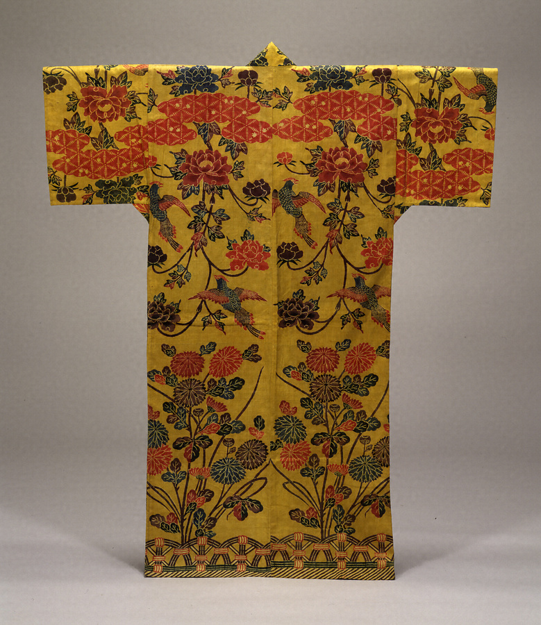 幅広の筒袖で、両脇に三角の襠(まち)がついた琉球衣装。尾長鳥(おながどり)に牡丹(ぼたん)唐草模様を紅型(びんがた)と呼ばれる大鎖模様の型染で表す。尾長鳥は王族の模様である。赤色の雲模様の内部には、糸絞(しぼ)りを思わせる模様が紅型で染められ、日本(本土)の模様の影響がうかがえる。