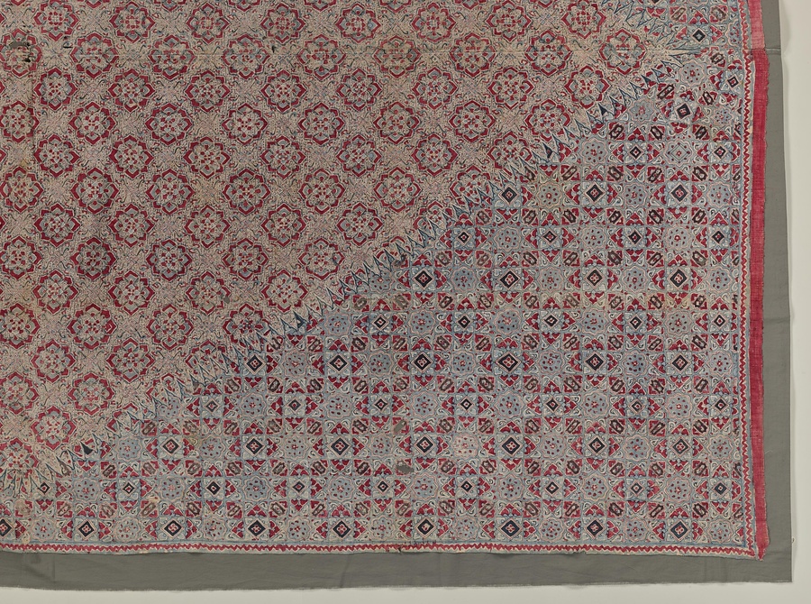 スマトラ島南部のランプンで発見された更紗で、同文様の裂【きれ】を2枚はぎ合せています。中央の菱形の区画と周囲で文様を変える特徴は、インドネシアの王侯貴族用のバティックに類似します。インド更紗とバティックの関連性をうかがわせる作品です。