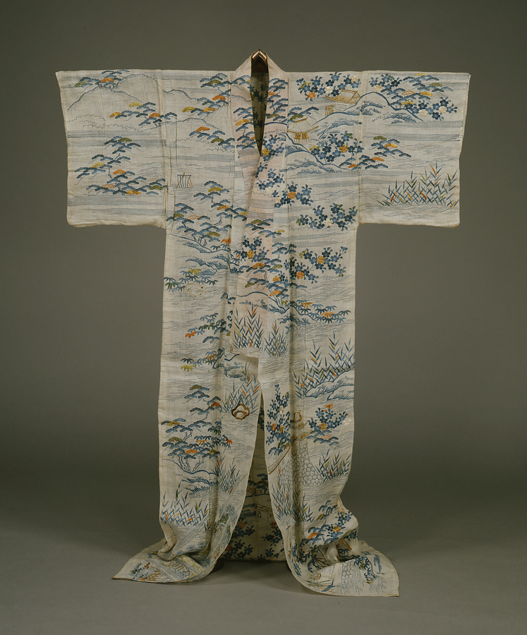 麻地に藍+あい+の濃淡で模様を染め出す茶屋染+ちゃやぞめ+は、江戸時代後期の武家女性が着用する夏の料。「近江八景+おうみはっけい+」のうち、右肩の紅葉に彩られた石山寺の堂宇は「石山秋月+いしやまのしゅうげつ+」、腰のあたりの浮御堂に雁が飛来する「堅田落雁+かただのらくがん+」、裾の長い橋は瀬田の唐橋+からはし+で「瀬田夕照+せたのせきしょう+」の景を表わす。(高木結美氏執筆)