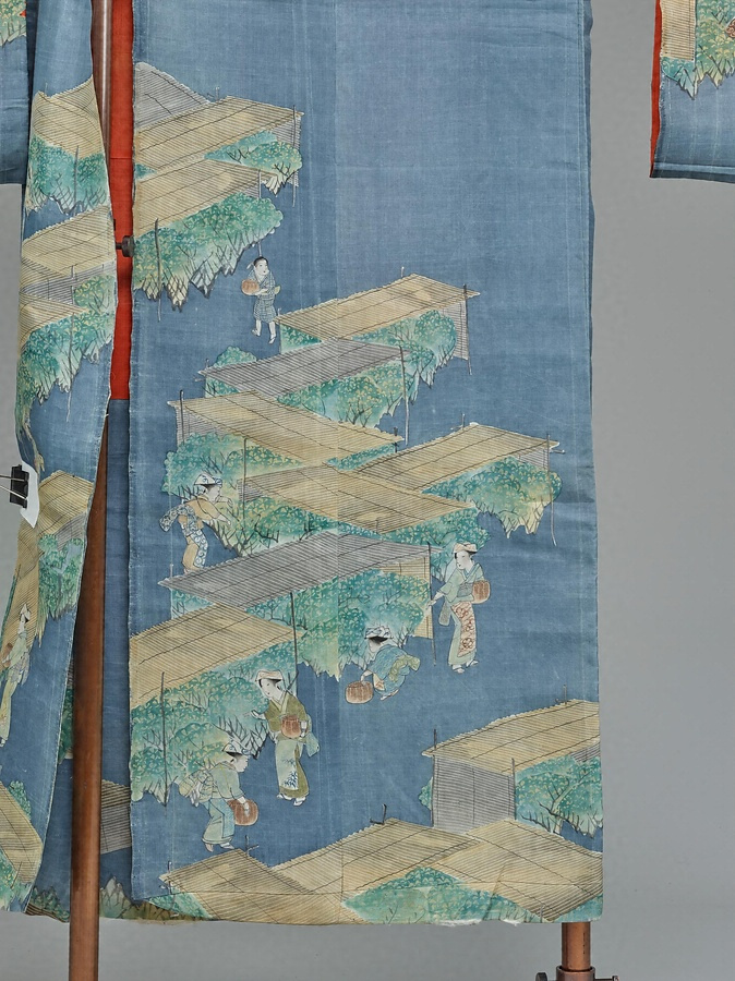 江戸時代後期には、描絵友禅染(かきえゆうぜんぞめ)で季節の風物や名所を裾模様に表わした小袖が流行した。町方女性の間では、藍(あい)・鼠(ねずみ)・茶(ちゃ)のような地味な色調が「粋(いき)」とされた。成人式でおなじみの大振袖も、この時期の流行の名残(なごり)である。2005/04/26_h101