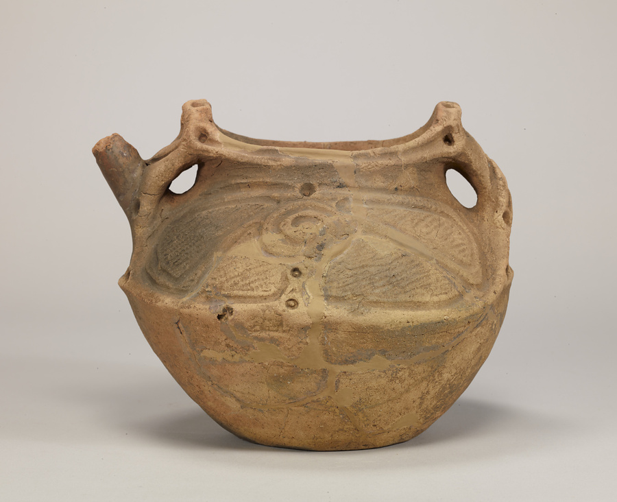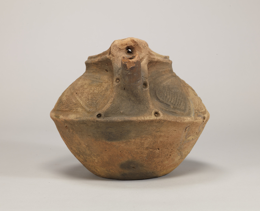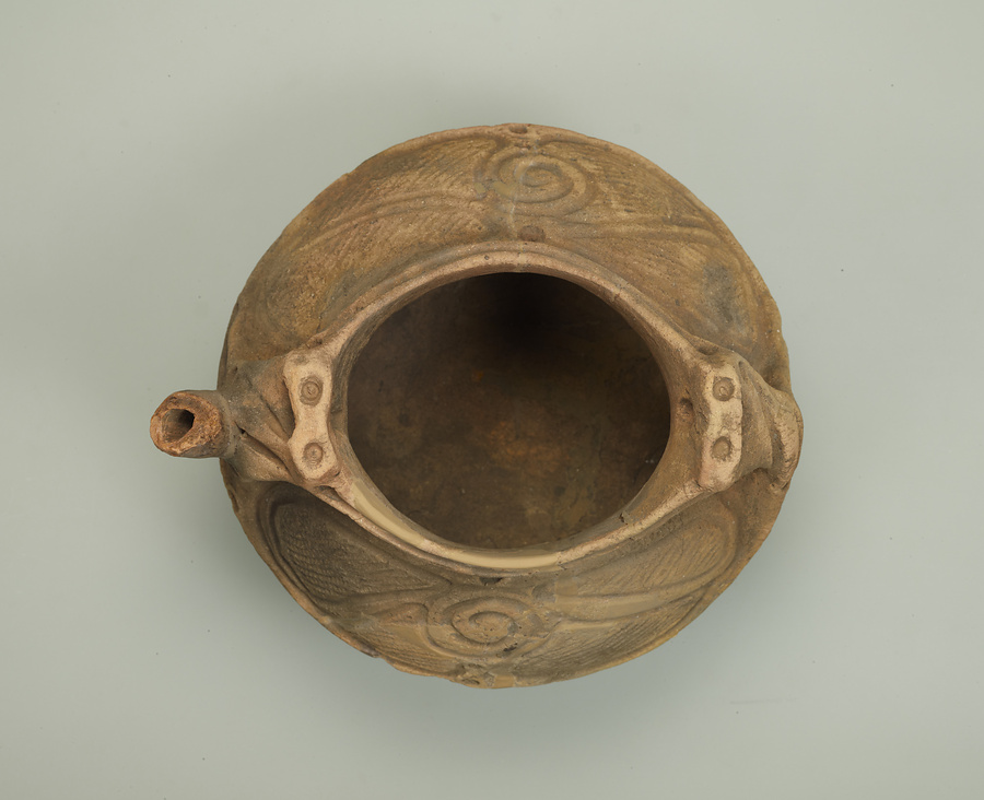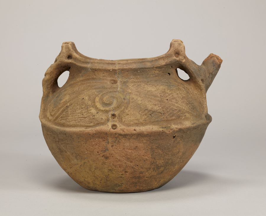 関東地方では縄文時代後期になると注口土器が器種の一つとして加わります。胴部は一般的に急須(きゅうす)形や算盤玉(そろばんだま)形をなすことが多く、口縁部の両端には把手、その一方には注口がつけられます。胴部には磨消縄文(すりけしじょうもん)手法を用いてしばしば渦巻文が描かれます。(20120221_平企)