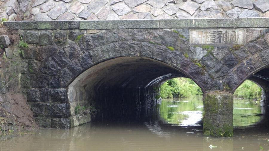 尾張三河の国境をなす境川の右岸に位置する。水田からの排水を集めた五箇村川が、明神川と立体交差する地点に築かれた樋門。石造二枚厚の欠円形二連アーチからなる通水部の上に、人造石工法で築いた壁体を重ねる。服部長七の関与が明らかな貴重な人造石遺構。