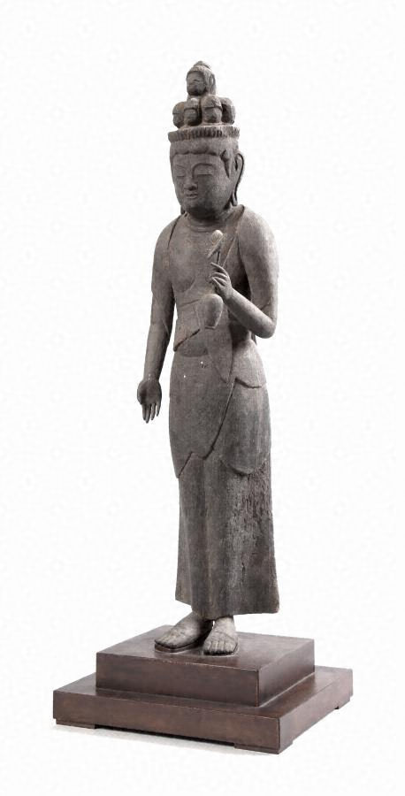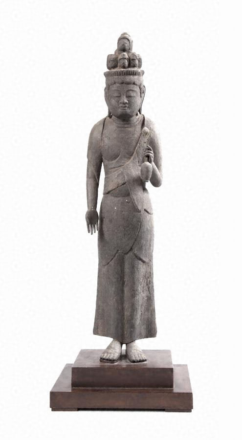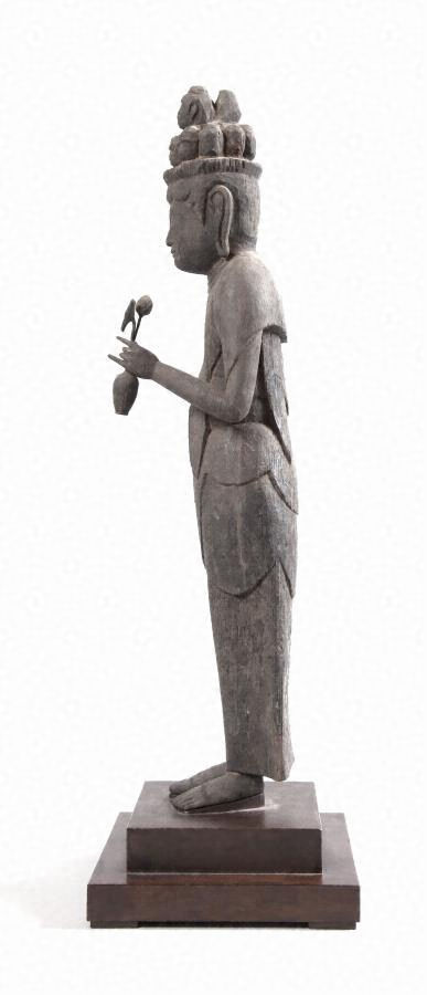天冠台は列弁のみ(後方は刻まない)、地髪部はマバラ彫り(後方は平堀)とする。目は上瞼を膨らませ、上瞼下を斜めに彫ることで目の形を表している。三道相を表し、耳朶は不通とする。右手は下に垂らし、掌正面に向けて五指を伸ばす。左手は屈臂し蓮華を挿した水瓶を執る。胸と腹の括り線は各一条で表す。右足をわずかに前に出して台座上に立つ。