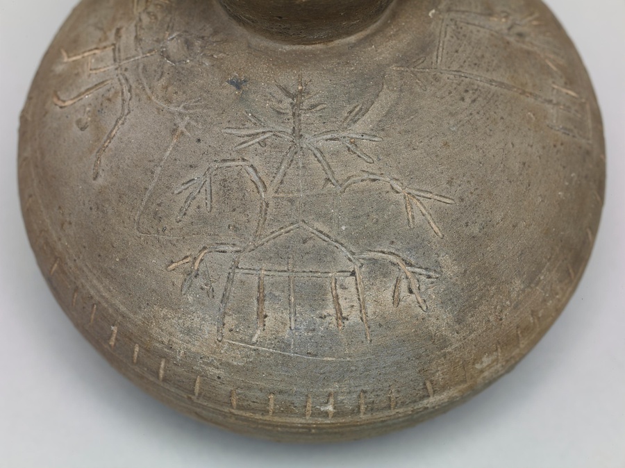 線刻で絵画を描く、珍しい須恵器です。絵画は3種類あり、馬に乗って手綱【たづな】を取る司祭者とみられる人物、樹枝状の屋根飾りがある祭殿とみられる建物、聖域を示すとみられる高い柱に掲げられた吹き流し状の旗があります。古墳時代の特別な出来事や場面を示しています。