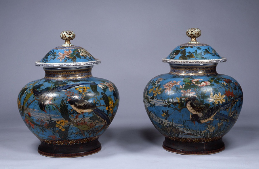 この作品は七宝の素地として磁器を使った磁胎七宝の大作。磁胎七宝は明治10年代までは盛んに行われており、愛知七宝の名工竹内忠兵衛が瀬戸の初代川本桝吉による有蓋大壺に七宝を施している。明治14年(1881)第二回内国勧業博覧会に出品された。