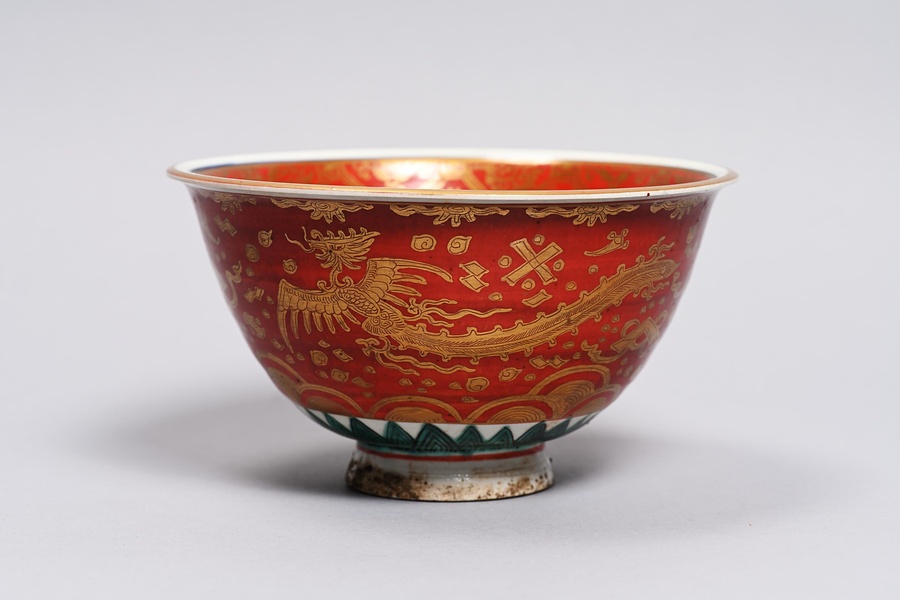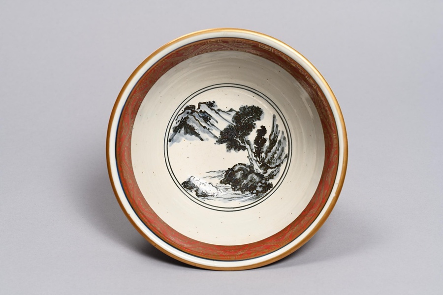 永楽和全(わぜん)は京焼の陶工。慶応元年(1865)より明治3年(1870)まで加賀(現在の石川県)大聖寺(だいしょうじ)藩の招きにより九谷で作陶を行った。この鉢は和全が得意とした中国の金襴手(きんらんで)の写しである。裏面に「於九谷永楽造」の銘が赤絵で記されている。(20110102_h133)