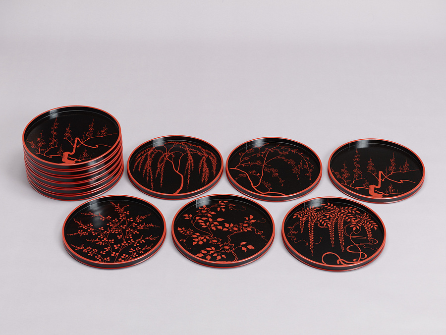 花樹絵替り漆絵丸折敷 惺斎好 惺斎在判