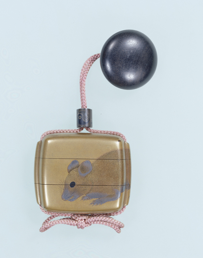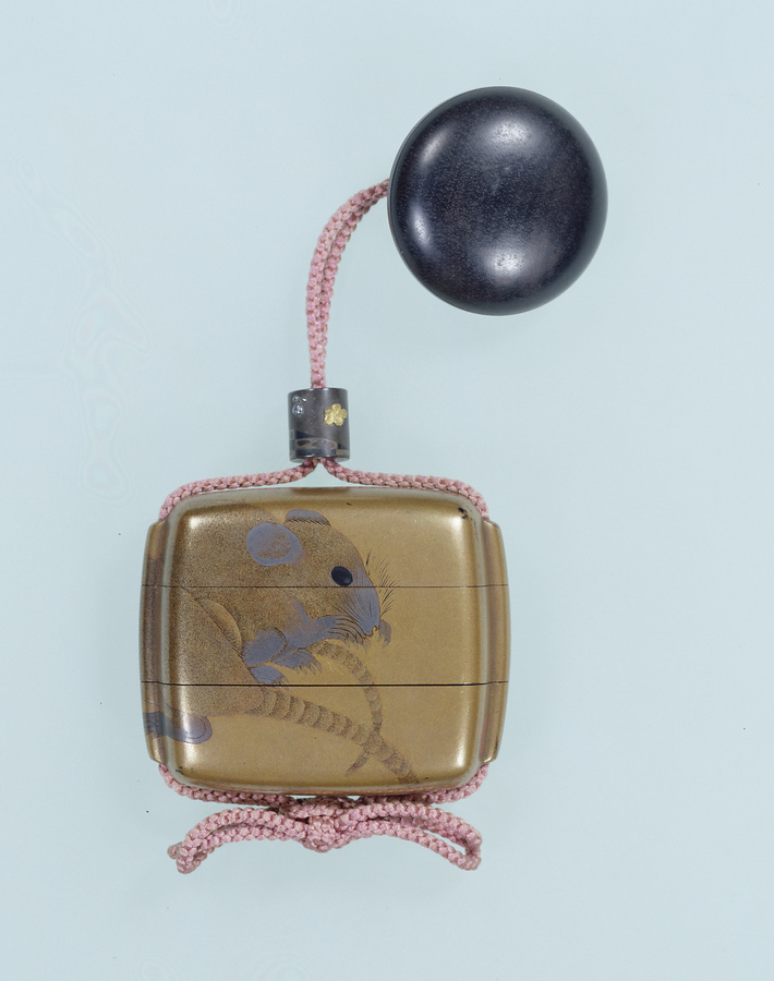 印籠は、薬などを入れる携帯用の容器でしたが、江戸時代の中ごろからは主に装身具として用いられました。これらの印籠は江戸中期の蒔絵師、塩見政誠の作品で、鼠を表裏連続して配した大胆な構図と、毛の一本一本まで蒔絵であらわした精緻な表現が印象的な作品です。