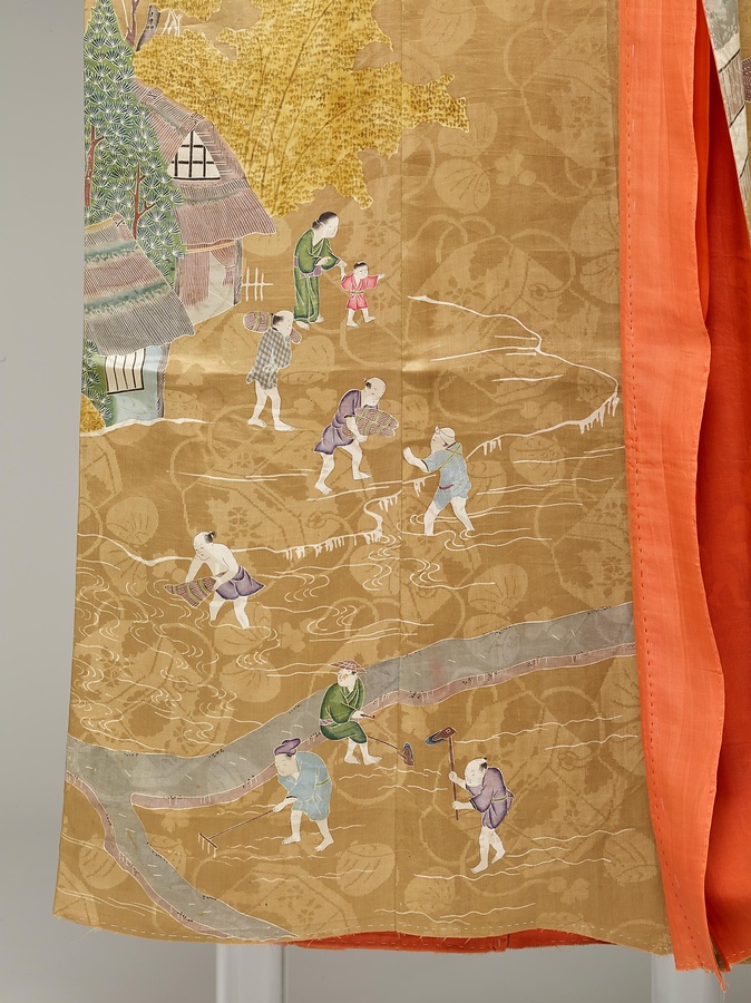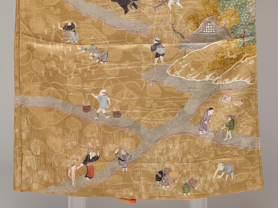 貝桶模様を織り出した綸子地を茶色に染め、淡彩による友禅染で春から秋にかけての農業のいとなみを表す。一見、地味な色調ながら、町人にはなじみのない耕作風景の細やかな描写や綸子の地紋などを凝らす所に、江戸時代後期の「いき」な好みが表れている。