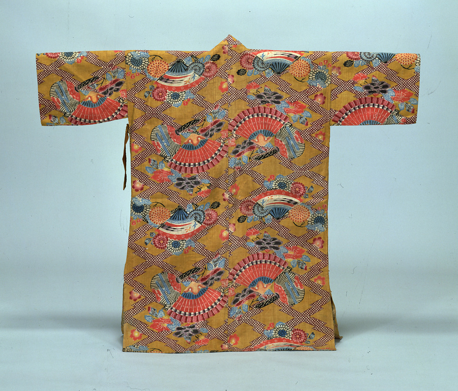 ドゥジン(胴衣) 黄木綿地松皮菱繋菊椿檜扇団扇模様