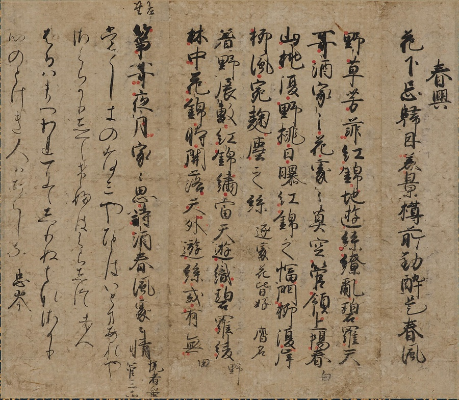 『和漢朗詠集』の断簡。もとは綴葉装(てっちょうそう)の冊子本として伝存したが、昭和14年(1939)京都で分割された。これにちなんで京都の旧国名山城をとって名付けられたもの。藤原定頼筆と伝えるが、その書風から推して、12世紀の書写と推定される。