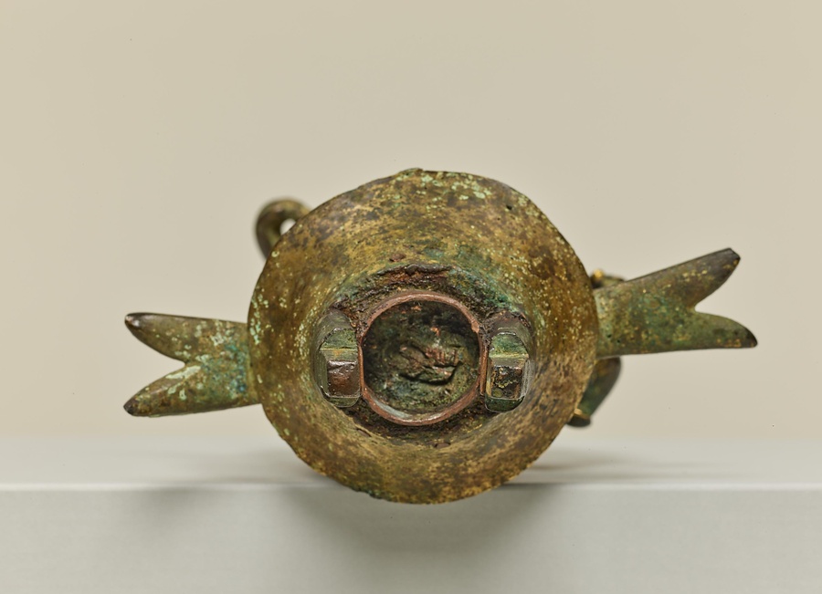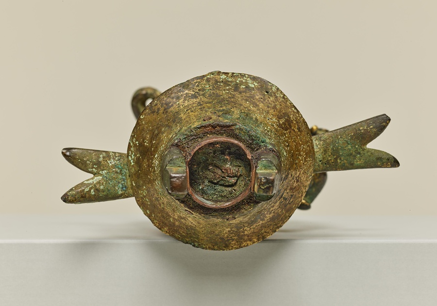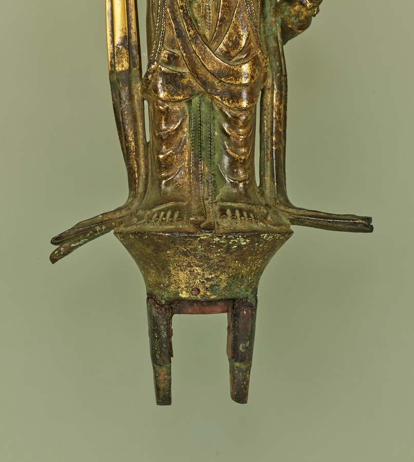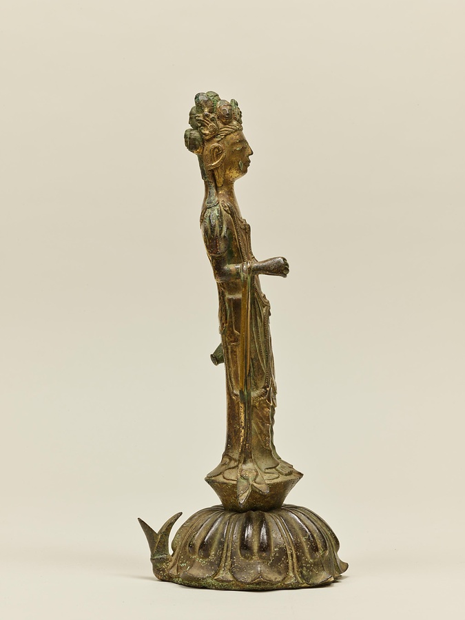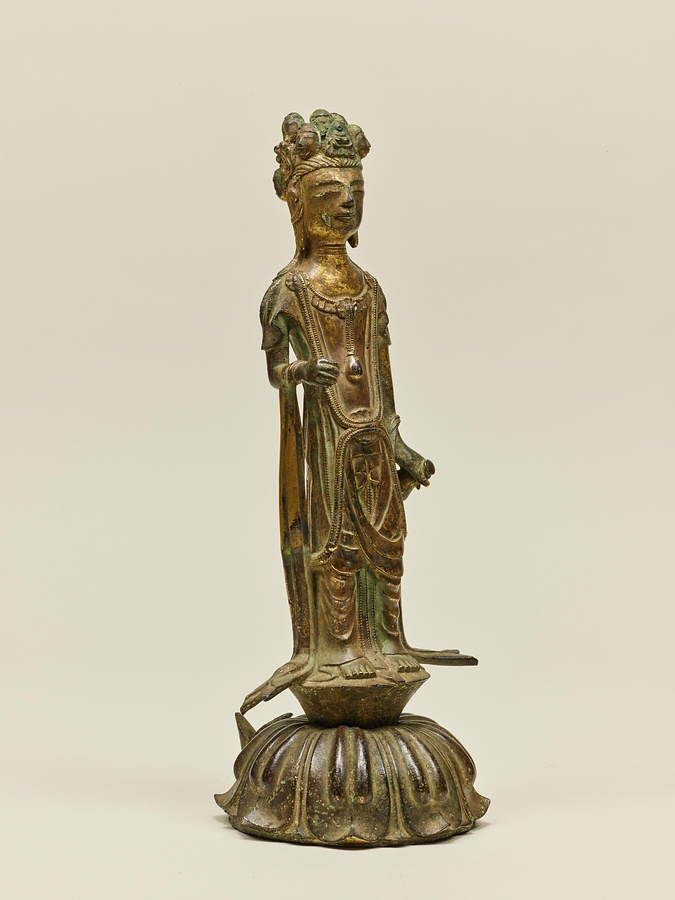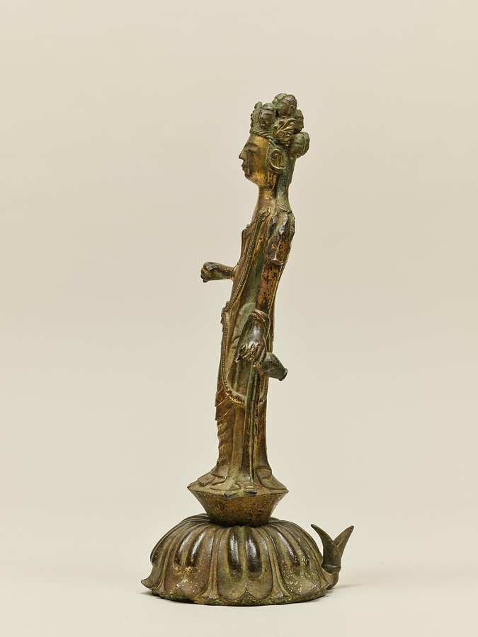まずは、十一面観音を正面から見てみましょう。顔は幼い子どものよう。からだは直立していますが、少しだけ左足を曲げ、わずかに動きを感じさせます。横から見ると、胸を引いておなかを出し、そっくり返るような姿勢です。これらは飛鳥時代の後期、いわゆる白鳳文化期の仏像の特徴です。最後に後ろから見てみましょう。たくさんの顔が頭の上からにょきにょきはえているような様子が印象的です。5つの顔がうしろを向いているのに驚いた方もおられるのではないでしょうか。じつは、多くの十一面観音は、頭のてっぺんに1面、正面と左右に各3面、後ろに1面がぐるりと配されていることが多いのです。また、通常は頭上に11面、本体の顔と合せて12面なのですが、この像は頭上に10面、本体の顔とあわせて11面になっています。こうしたかたちは古い時代の様式とされ、この作品は日本に数ある十一面観音菩薩像のなかでももっとも古い例のひとつと考えられています。