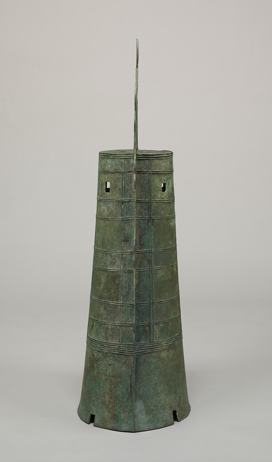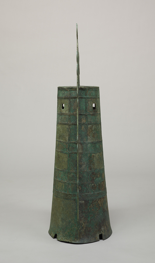 身を飾る文様が僧侶の羽織る袈裟+けさ+に似るところから袈裟襷文銅鐸と呼ばれている。銅鐸は弥生時代を代表する祭器で、本例はその変遷過程の最も新しい段階(突線鈕+とっせんちゅう+式)に位置づけられるもの。均整のとれた形と繊細な文様は、当時の優れた鋳造技術を反映している。
