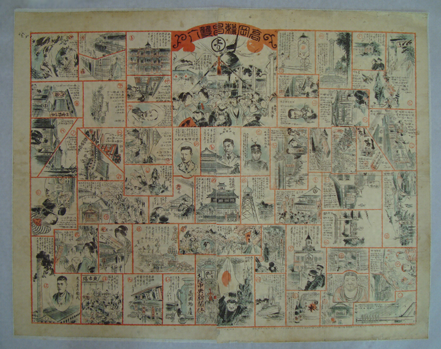 明治33年(1900)元日の『北陸中央新聞』附録の双六。この双六には、当時高岡で話題となった出来事や、名所・人物・施設などの様子がイラストを交えて賑やかに描かれる。同年6月の高岡大火前の様子がわかる貴重な資料でもある。