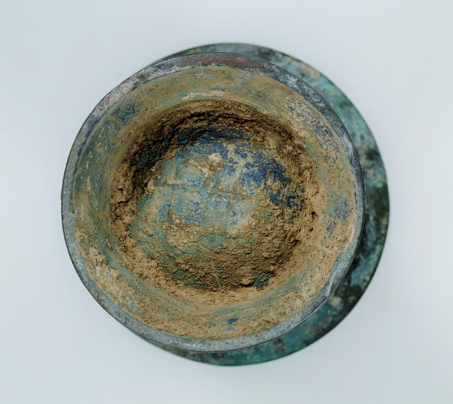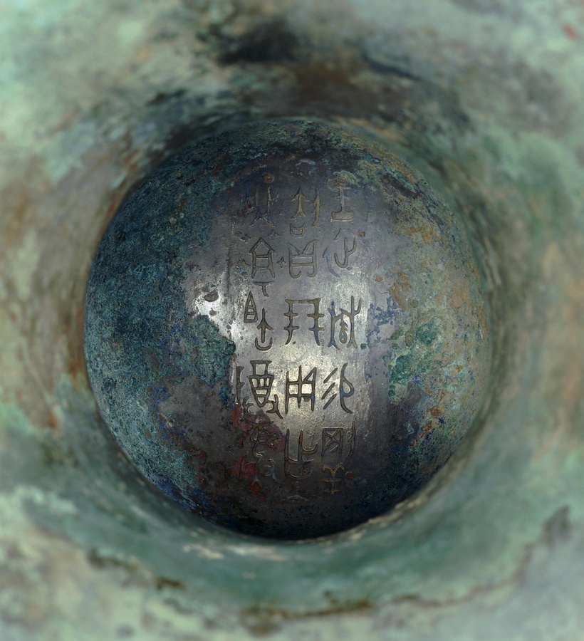胴の中ほどに縦方向の隆起線を密集して並べ、その上下に尾の長い鳥の文様を飾っています。内底に17字の銘文があり、剛刧という人物が戦争で手柄を立て、王からタカラガイを下賜されて、この尊を作ったと記しています。