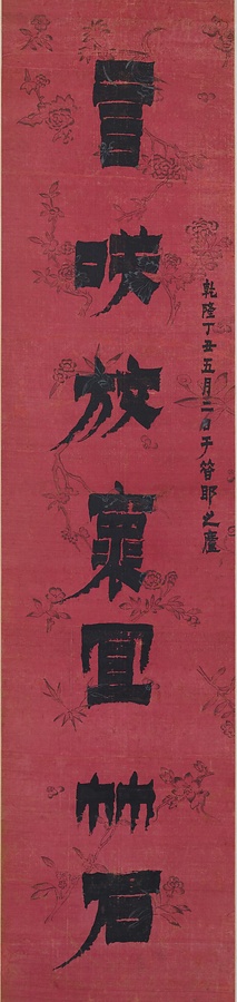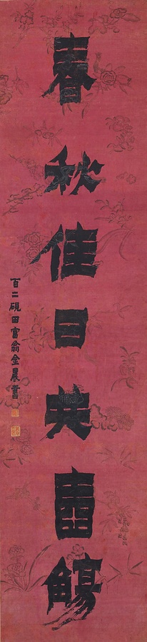 「庭の竹石を愛でて思いのままに談笑し、春と秋のよき日には共に杯を酌み交わそう」という意味の七言の対句を、華美な紅色の彩箋に対聯(ついれん)形式で書いたものです。18世紀、揚州(ようしゅう)を中心に奇抜な作風でもてはやされた金農(きんのう)による漆書(しっしょ)の様式をよく伝えています。