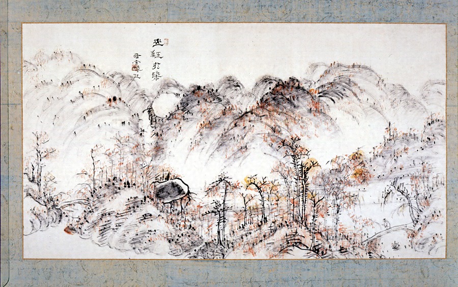 岡山池田の藩士の家に生まれた玉堂は、藩主の政治の理想を継承しつつ、大目付の地位に就くが、文人的生活に耽るあまりその地位を罷免され、その後一切の官職を退いた。五十歳の時二人の息子を連れて出奔し、旅先から脱藩を届け出、以後自由人として各地を旅歴し、漂泊の人となった。脱藩後の漂泊の足跡は、九州から奥羽にまでおよんだ。彼の絵は文化年間より多く生み出されたようで、渇筆と擦筆が混じり合った独特の様式はこの頃完成したと思われる。 「山は染むるよりも紅なり」の意。玉堂画中もっとも色彩あふれる作品のひとつである。代赭を主とし、黄色の雌黄を加えている。墨線は渇筆、擦筆、濃墨との調和が絶妙である。