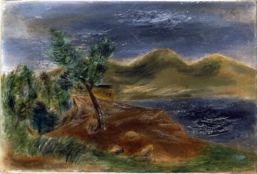 岡山市に生まれる。1905年に渡米して職業を転々としながら、ロサンゼルス美術学校の夜学に学んだ。1910年にニューヨークに移り、1914年からインデペンデント・スクール、1916年からはアート・ステューデンツ・リーグでケネス・ヘイズ・ミラーに学んだ。1922年にニューヨークで初めての個展を開催、1929年にはニューヨーク近代美術館主催「19人の現存アメリカ作家絵画展」に選ばれてアメリカでの評価を確かなものにしていった。この間、1925年と1929年の二度ヨーロッパを旅行しジュール・パスキンと交友し、制作面でも影響を受けた。1931年から翌年にかけて父の病気見舞いのために帰国し、1933年からはアート・ステューデンツ・リーグで教鞭をとるようになった。1944年には「1944アメリカ合衆国展」で一等賞を受賞するなど、第二次大戦期から戦後にかけてもアメリカを代表する作家の一人として活躍を続けた。ニューヨークで没。 国吉の制作は、初期の素朴で空想的な表現を特徴とするものから、パスキンの影響をうかがわせるものを経て、1940年代前半の大戦期の不安な精神状況をもの憂げな表情を見せる女性像などに託して表現した作品群、そして戦後の表現主義的な作風のものへと展開していった。《荒天》は、国吉が自己の様式を確立した時期、即ち1930年代の制作を端的に示すものである。どこかの入江の情景であろう。手前岸辺の風を受けるかのように幹を斜めに湾曲させてる一本の樹と周囲の潅木や草の緑は、岸辺の土や岩の赤茶と絶妙の調和を見せる。そして向こう岸には単純化された形態の黄土色の山と、それを挟むかのように配された重い灰色の空と、その空の色を映してざわめき立つ水面などに、彼の制作を特徴づける色遣いと抜きんでた描写力が示されている。ダウンタウンギャラリーでの個展に出品された作品である。(M.M.)
