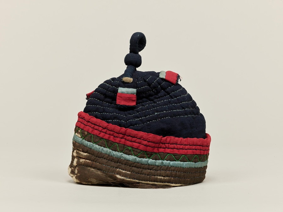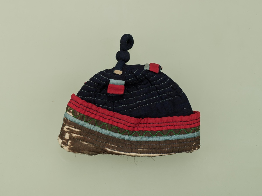 樺太アイヌは頭に被るものをハハカと呼びます。本例は女性の冬用頭巾で、防寒のためにキルティングが用いられています。頭頂部にはループ状の組紐が付されています。