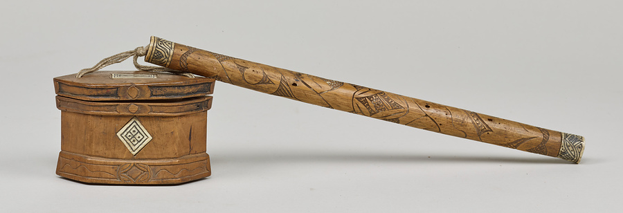 アイヌ文化において煙草+たばこ+は、社会的・文化的に重要な意味をもつものであり、常に煙草・煙管+きせる+・煙草入+たばこいれ+を携帯していた。煙草入は、美しく装飾された印篭形+いんろうがた+のものが多い。本例は蓋の中央と胴の両側面に鹿角製飾板をはめ込み、煙管差の両端に鹿角製装具が付属する。(20160102_h16)