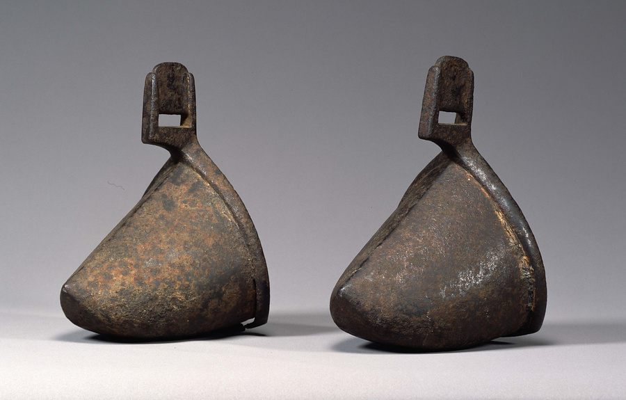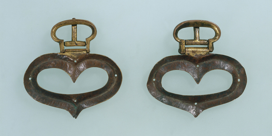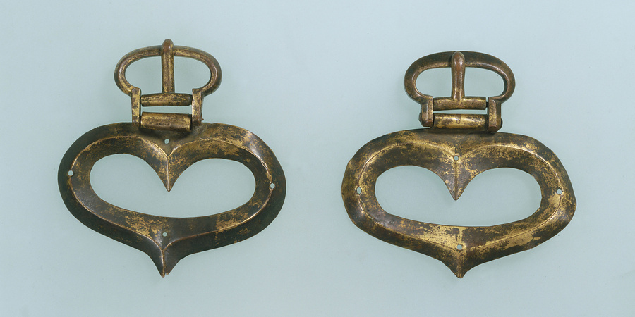 法隆寺献納宝物には一組と一点の壺鐙(つぼあぶみ)がある。これらには金銅製の鉸具付心葉形杏葉(かこつきしんようけいぎょうよう)が付属するが、これは鐙と馬の胴部を隔てる障泥(あおり)にともなう金具である。天保13年(1842)『御宝物図絵(ごほうもつずえ)』に聖徳太子が物部守屋(もののべのもりや)を討伐した時に用いたとの伝えがしるされている。