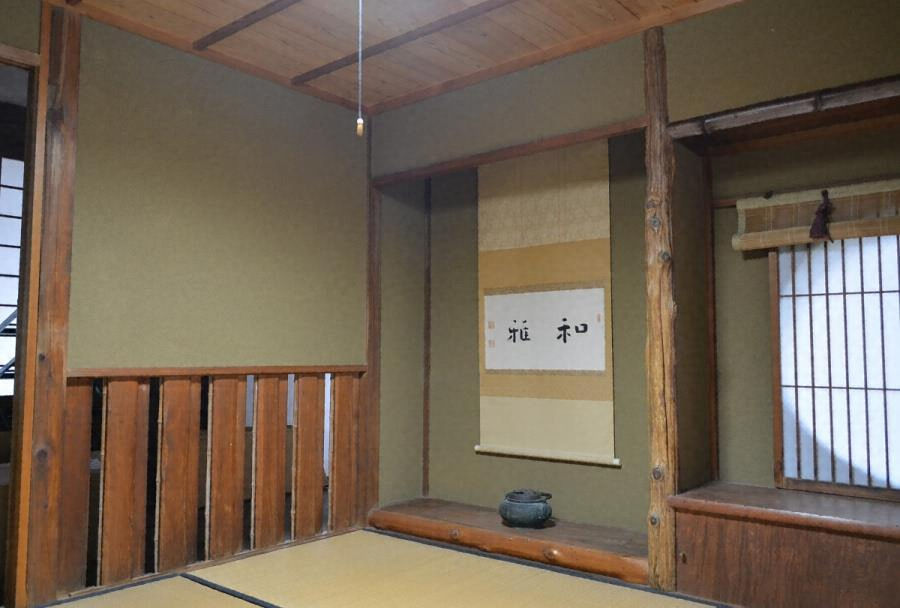 百々ヶ峰南麓の浄土真宗寺院の本堂と庫裏を繋ぐ渡り廊下と、その南側の唐破風玄関、北側の切妻造茶室からなる建物。茶室は四畳半で西面に床構え、床脇に円窓、東に水屋を配す。茶室と廊下境壁の腰を無双窓として来客を知る。寺院の機能的な玄関と接客空間。