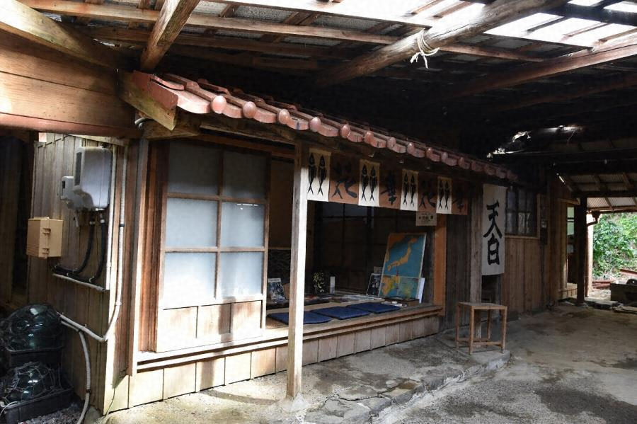 太平洋を望む大王崎に建つ鰹節製造業の住宅である。東の崖と南の道路から一段低く敷地を構え、木造平屋建の切妻造桟瓦葺、竪板張の外壁で風に耐える。現在は一階南西の四畳間で商品陳列し、他は物置とする。波切漁港の水揚げを直ちに加工できる好立地にある。