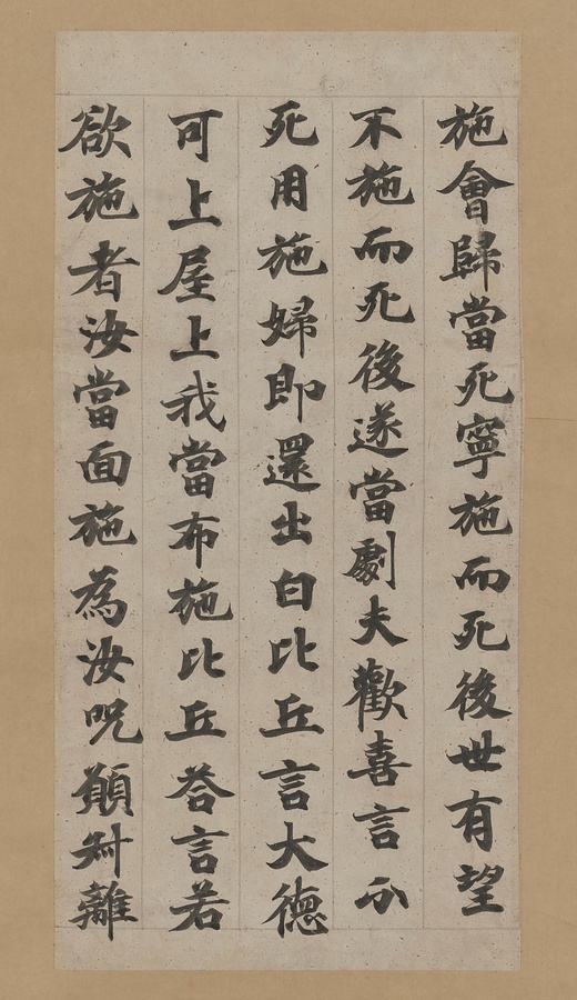 仏教的な立場からみた賢人と愚人の寓話(ぐうわ)を集成した経典です。聖武天皇筆として「大聖武」と称され、大和(やまと)国の東大寺に伝来したため、その断簡を「大和切」とも呼びます。古筆手鑑(てかがみ)の巻頭に押され、手鑑の格式を示す指標ともされます。料紙はマユミの繊維から作られた白荼毘紙(しろだびし)を用いています。