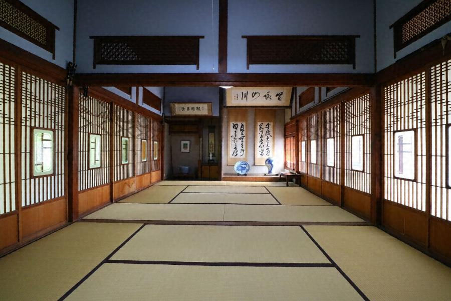 水路に囲まれた敷地の北、金蔵の西に建つ隠居所。入母屋造桟瓦葺、四周に庇を廻らす。東に床棚付の座敷八畳と次の間六畳を東西に並べ、南北に縁を付しガラス戸を建て込む。部屋縁境の額入障子や欄間、付書院障子に用いた精緻な組子が目を引く近代和風の書院。