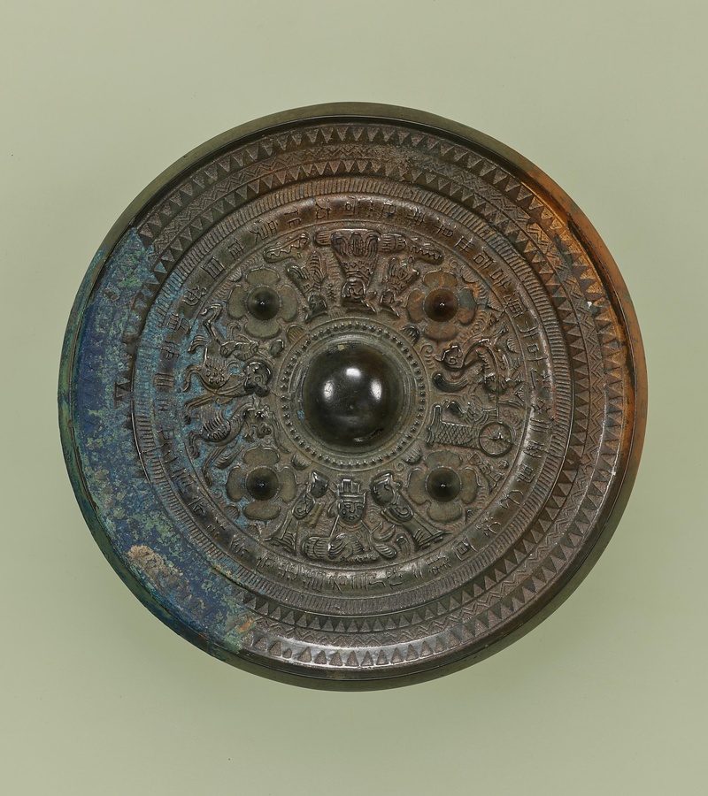 画像鏡は鏡の背面に、半肉彫りで表現された絵画的な図像をもつ。中国で後漢から三国時代にかけてつくられた。主文様の図像は画像石の表現と類似し、神仙(しんせん)思想にもとづいた神人、龍虎、車馬、狩猟などを主題とする。本例では東王父、西王母の二神仙と、龍虎、車馬が描かれる。