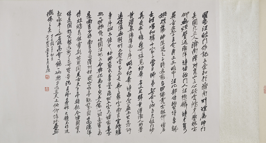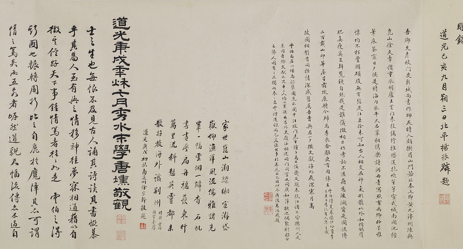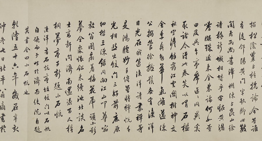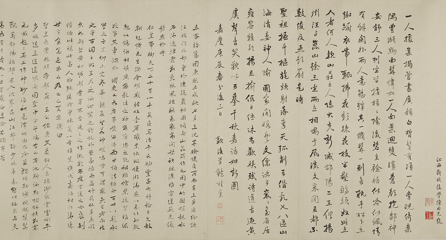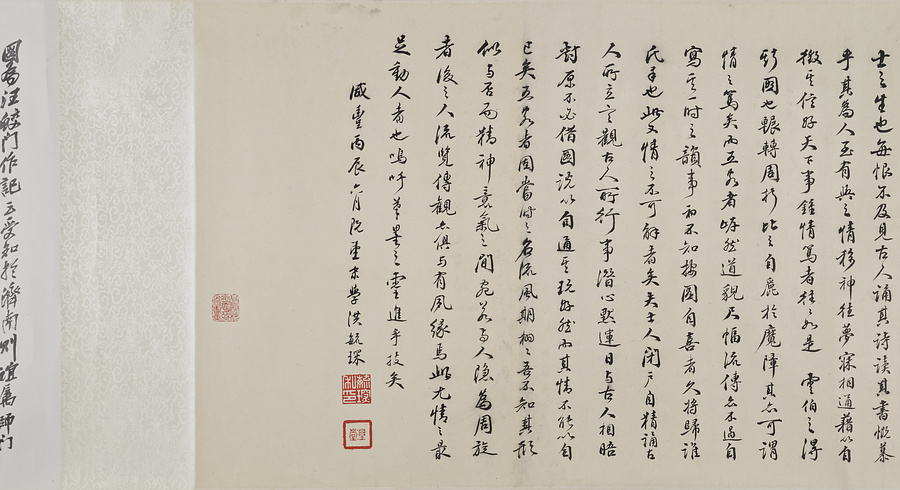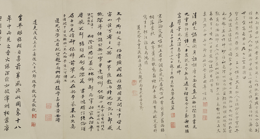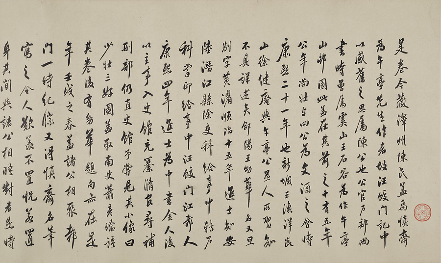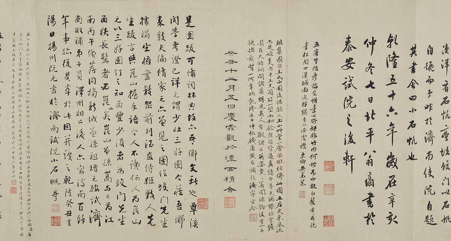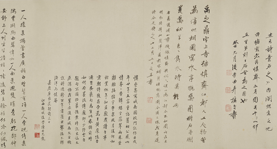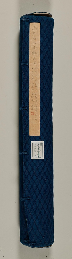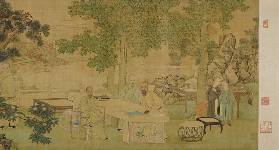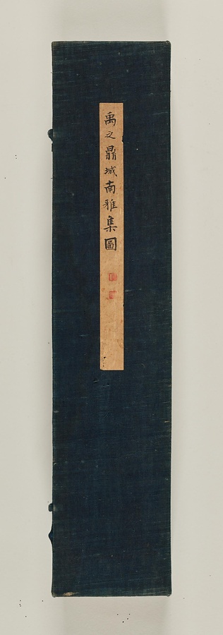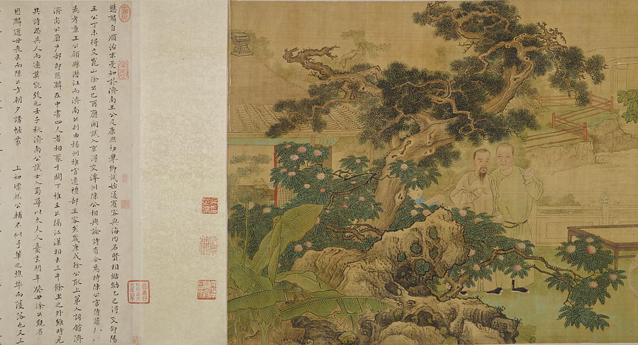 康熙21年(1682)、陳廷敬@ちんていけい@が城南山荘に友人の王士禎@おうしてい@、王又旦@おうゆうたん@、汪懋麟@おうぼうりん@、徐乾学@じょけんがく@らを招き、それを当時の肖像画の名手、禹之鼎に描かせたもので、当時の文人雅集の様子がわかります。書画のコレクターとして有名であった廉泉@れんせん@が来日時に山本悌二郎@やまもとていじろう@に譲り、のち高島菊次郎@たかしまきくじろう@へと伝来しました。