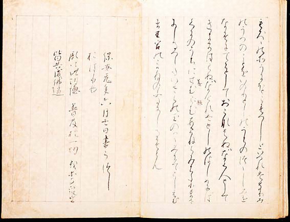 若くして仏門に入った尊子内親王のために、永観二年(984)に著された仏教の教養書。伝本が少なく、本書は現存最古のものである。白胡粉地に花菱唐草などの文様を雲母刷りにし、七行の界線を施した料紙を用いている。仮名に漢字を交ぜた優美な筆跡が好まれたため、かなりの部分が切り取られて「東大寺切」の名で諸所に分蔵されている。